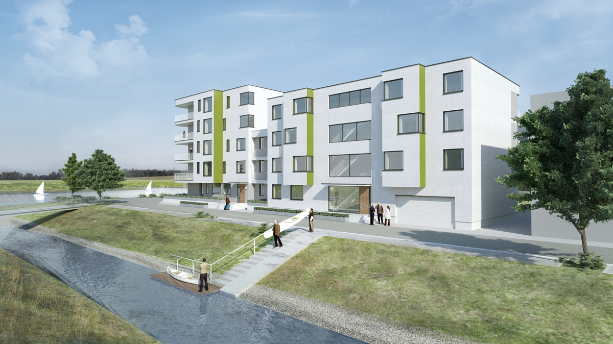 Der städtebaulichen Grundidee folgend werden die Kopfgebäude angehoben und schweben auf den Verbinderteilen, wodurch der öffentliche Uferbereich visuellfreigegeben wird. Die langen Straßenriegel werden durch Gliederung mit Erkern und Logienentschärft und setzen das Spiel der nebeneinandergestellten Teile, das Kopf und Verbinder vorgeben, folgerichtig fort. So entsteht eine Gesamtfigur mit rhythmischer Staffelung zum Wasser.